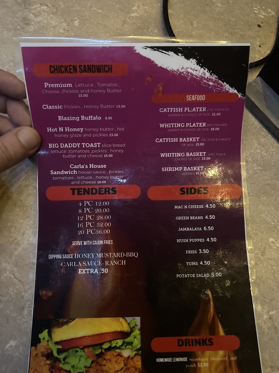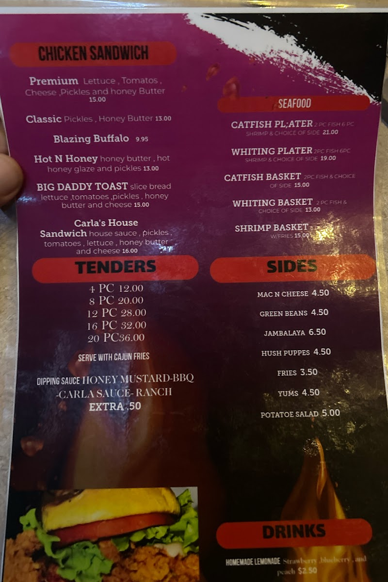 If you're in the mood for something else, Tenders are also on offer, though the price is not specified, and they provide a delicious alternative to wings. For sandwich lovers, the Chicken Sandwich section stands out with choices like the Premium sandwich ($9.99), the spicy Blazing Buffalo ($8.99), and the sweet and tangy Hot N Honey ($9.99). The Carla's House Sandwich and the indulgent Big Daddy Toast ($10.99) offer even more variety.
