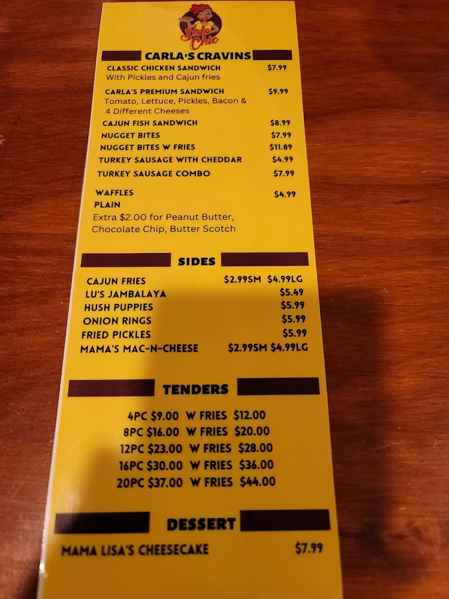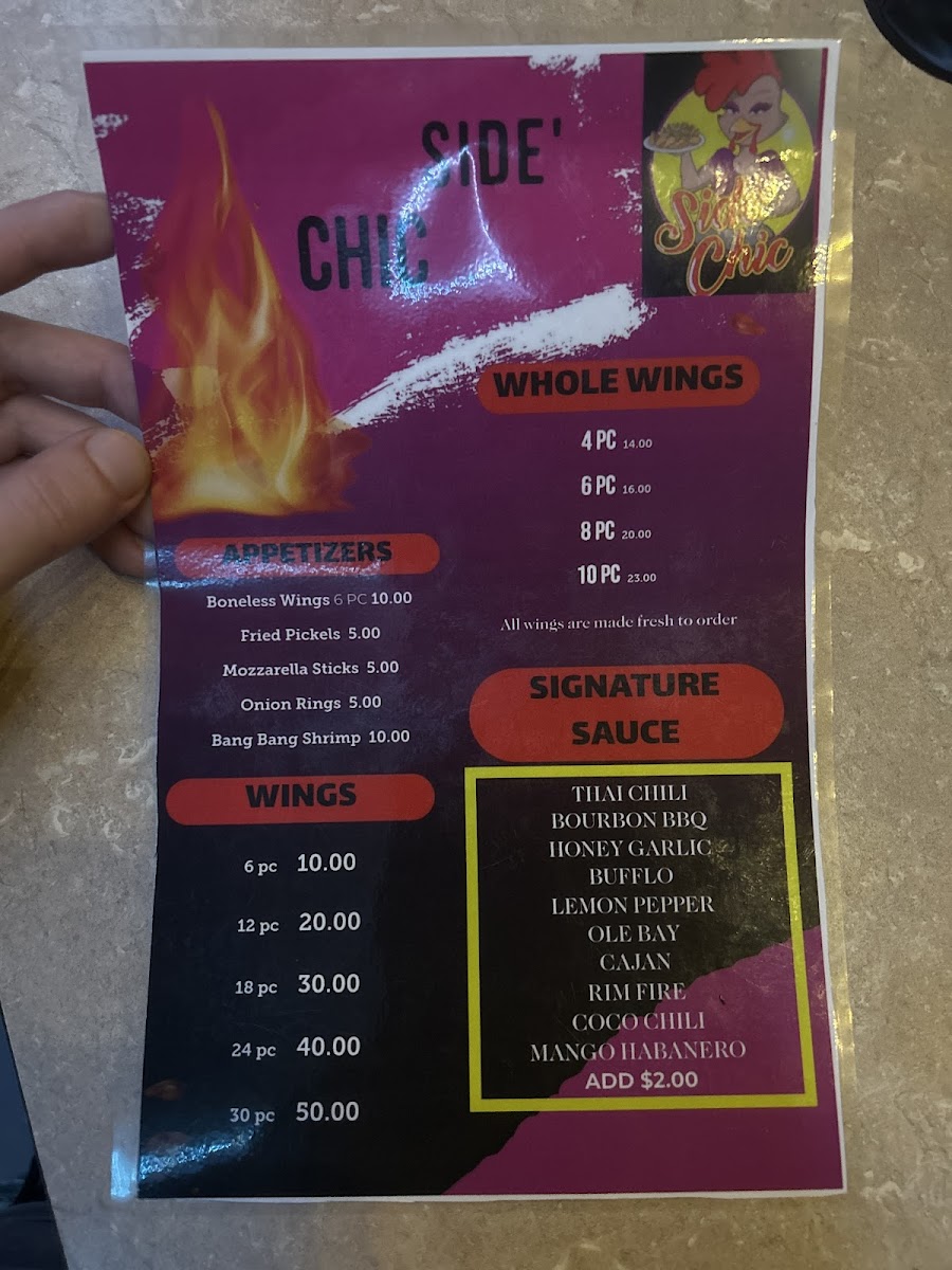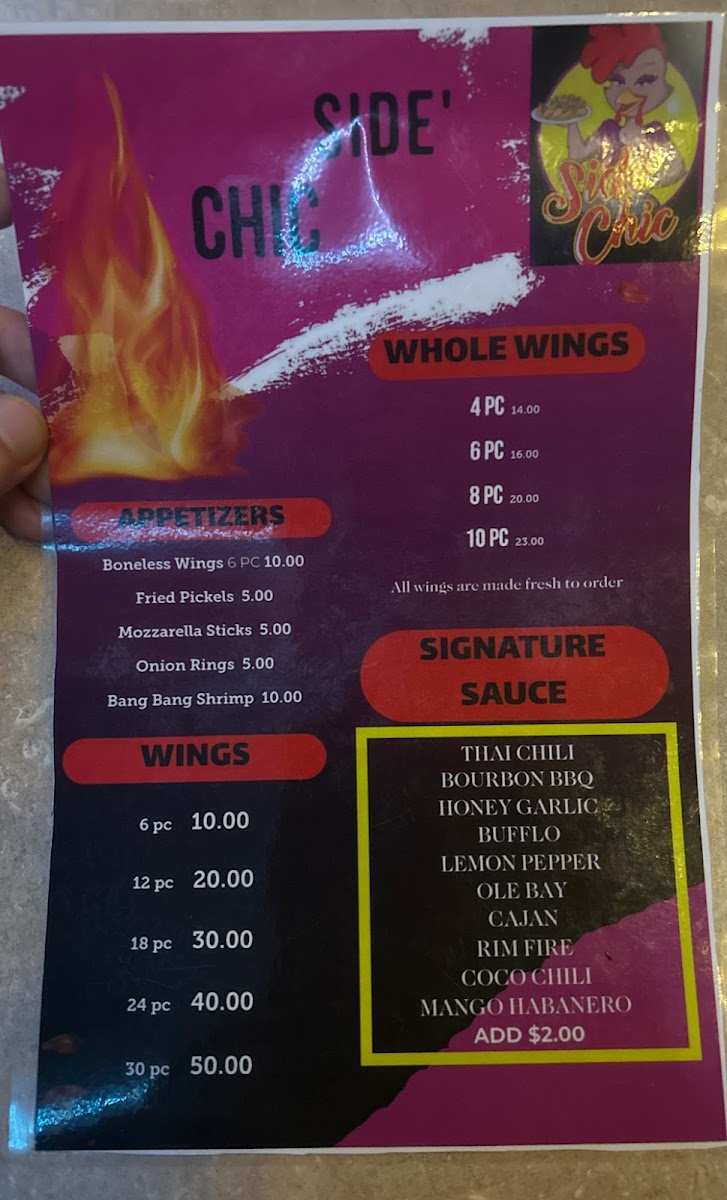 Overall, the Side Chic menu provides a perfect mix of fried comfort food, flavorful seafood, and refreshing drinks, with plenty of options to suit different appetites and preferences. Whether you're craving wings, a sandwich, or seafood, there's something here for everyone at a reasonable price.