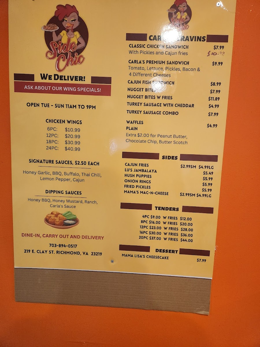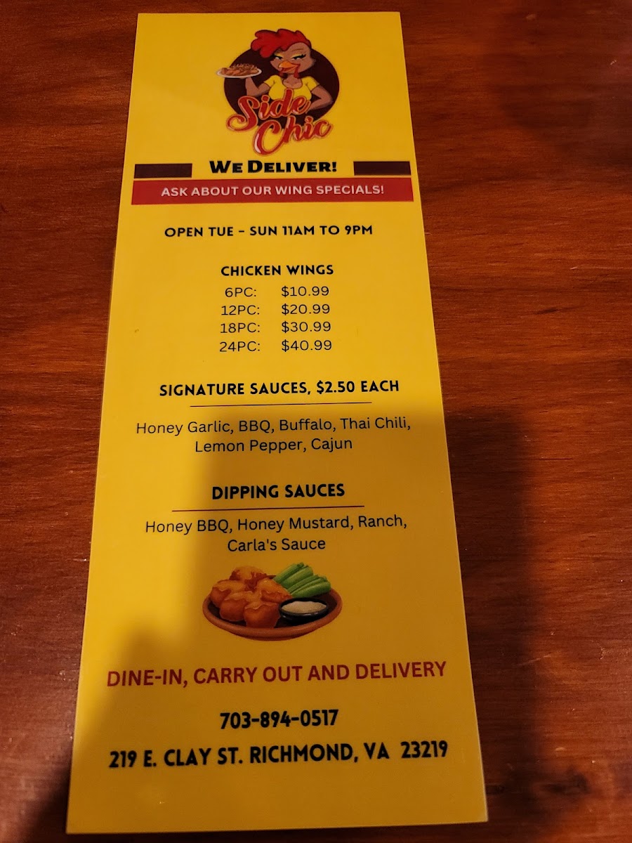 At Side Chic, located at 219 E Clay St, Richmond, VA, the menu offers a variety of options that cater to different tastes, making it a great choice for a casual meal with friends or family. The highlight of the menu is their Wings, available in several sizes such as 6 Pc for $6.99, 12 Pc for $12.99, 18 Pc for $18.99, and 24 Pc for $21.99. For those looking for a heartier serving, there are also Whole Wings, including options like 4 Pc for $8.99 and 8 Pc for $12.99.